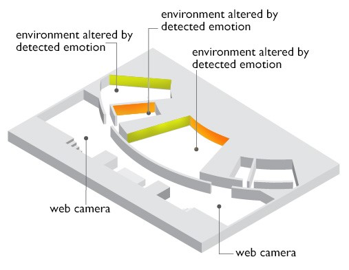 Considering historical examples, artists have explored the use of projected imagery or light works as a primary medium. These works may fall into one or more genre or may be in-between different genres of art. Looking at examples of installation, or environmental art works, the work of Dan Flavin [10] is exemplary in the use of light as a singular imaging medium. Flavin’s work, as he has described it, is created and experienced in a strict formalist approach. Formalism focuses on the way objects are made and their purely visual aspects. Nevertheless, the works, such as Flavin’s, though static light alter or inform audience spatial perception of spaces where they are installed. In our study of the use of interactive elements, can the viewer’s perception be altered by the shifting of color or imagery based on responses detected from the viewers themselves? Further, can we use the detection of subtle emotional cues to alter the qualities of the imagery or installation? More recently, the projection of video or animated imagery on building facades or in public spaces has become a common way to attract viewer engagement. In these types of new media art work experiences, such as the 2011 transformed façade of St. Patrick Cathedral and the New Museum in New York [12], these altered architectural and public spaces become a “canvas” where images and media content can be viewed outside of the special circumstance of the gallery or museum. Considering possible ways to allow for audience interaction, we know that sensors and vision systems are being used to encourage audience participation. Can subtle emotional cues be used as well?